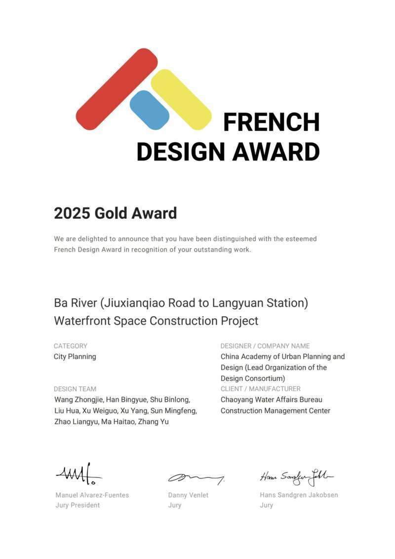 近日,在2025年法国设计奖的颁奖典礼上,坝河(酒仙桥路至郎园段)滨水空间建设工程荣获金奖。这条承载着北京记忆的河道,成为东方城市生态设计的璀璨名片。